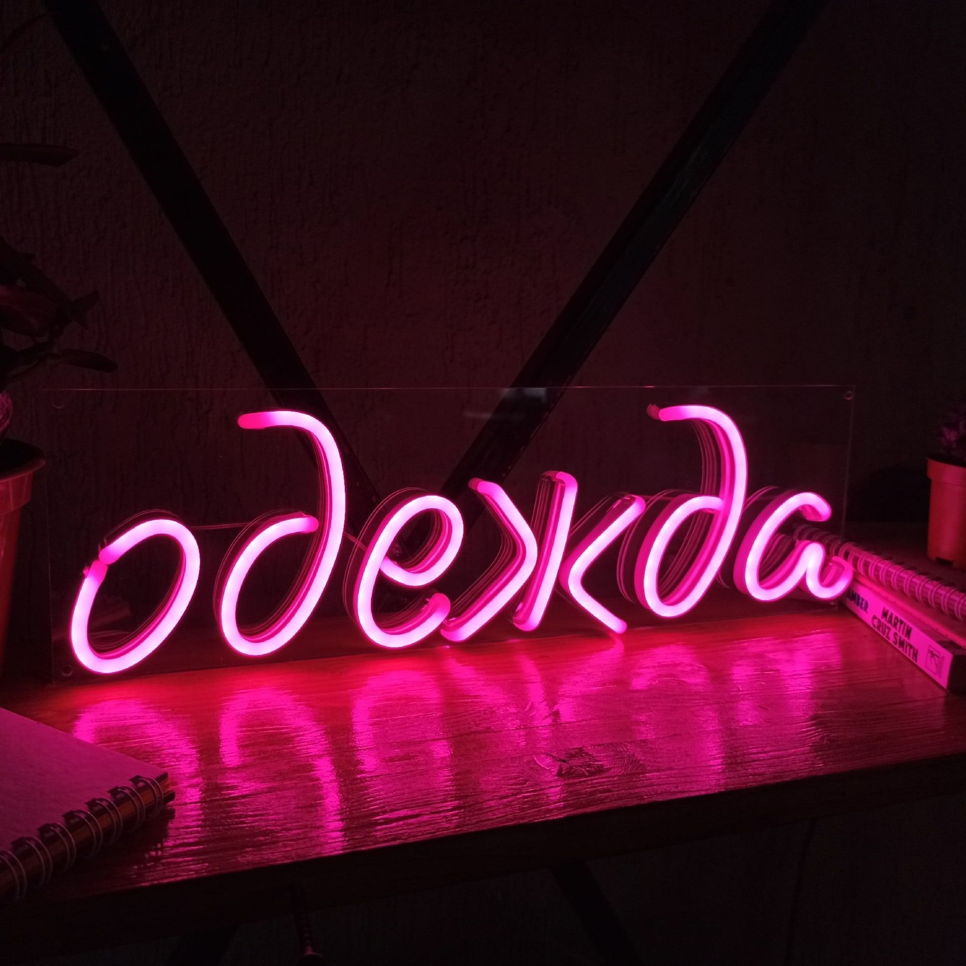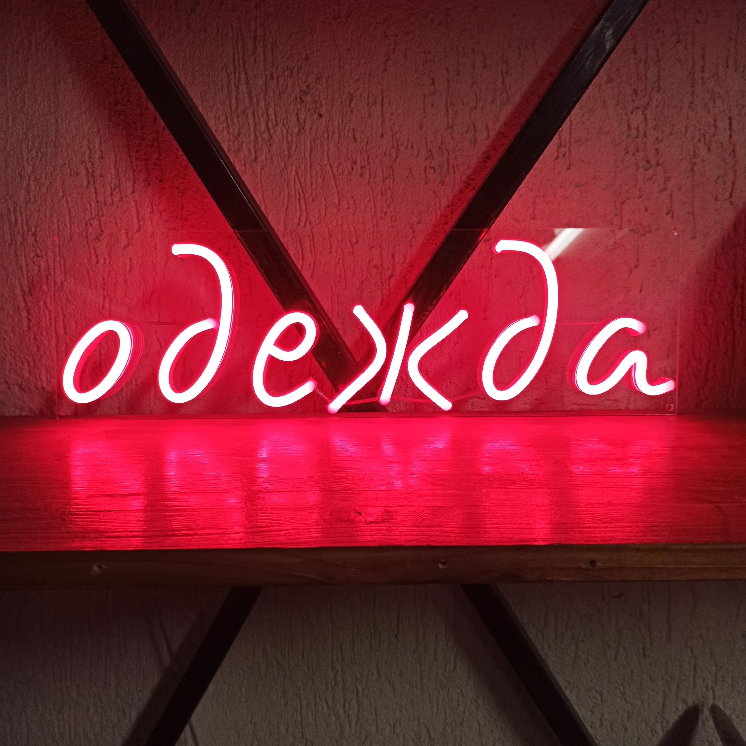 Вывеска из гибкого неона. Гибкую трубку со светодиодами внутри режут ножницами в отмеченных местах и придают форму, соединяя контакты пайкой или клипсами. Готовую надпись или изображение закрепляют на подложке из пластика, фанеры. Также для большей прочности и защиты трубки могут вставлять в корпус из алюминиевого профиля.