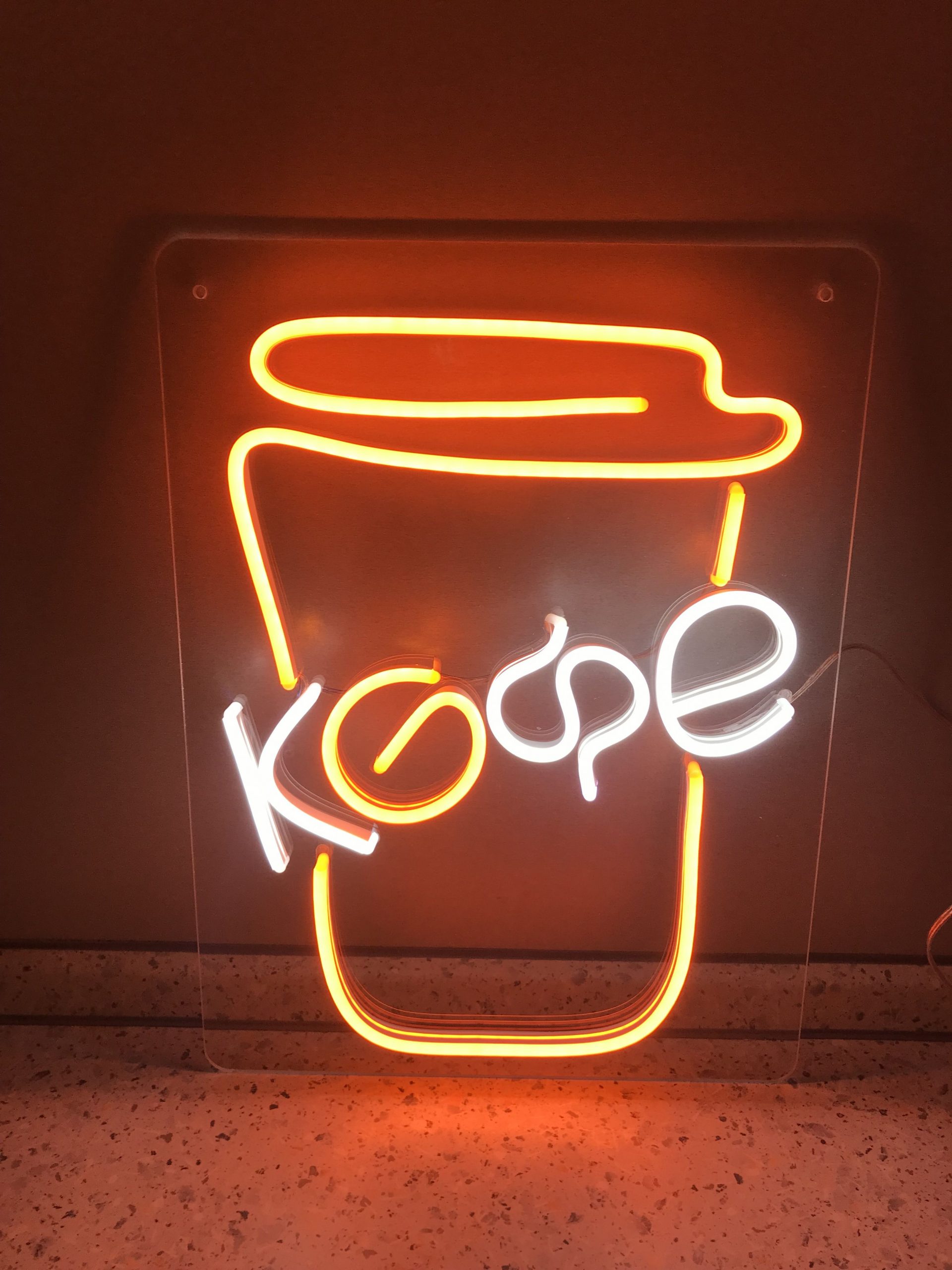 На встрече с клиентом уточнили размеры места установки (витрина), бюджет и требования к дизайну вывески. Был разработан эскиз: надписи в красном и оранжевом цветах. Неоновая вывеска изготовлена в несколько этапов. Сначала подготовили дизайн с формой букв и элементов, затем из стекла выдули трубки нужной формы, которые стали основой для неоновой лампы. Внутри трубок был создан вакуум и добавлена смесь инертных газов, которые начинают светиться при подаче электричества.