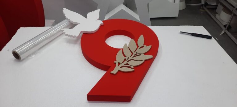 Для вырезания рекламных элементов применялся фрезерный ЧПУ станок для раскроя листовых материалов модель TS-1325 D. Скорость раскроя материала была выставлена на 70 см / мин. Его рабочая зона составляет 1300 х 2700 мм. Общий вес станка — 47 000 кг.