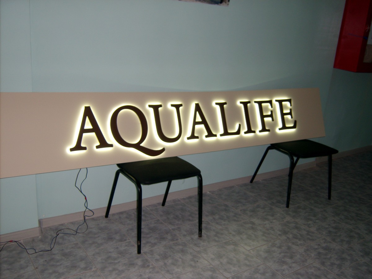 Для лицевой подсветки использовали светодиодную ленту нейтрального белого света 5000 К. Ленту закрепили на перегородку внутри панели, а стыки для защиты от влаги залили жидким пластиком Cosmofen. Блок питания с уровней защиты IP67 спрятали в антивандальный короб за вывеской.