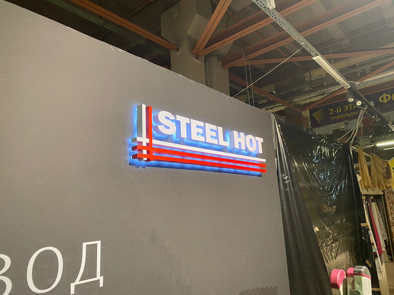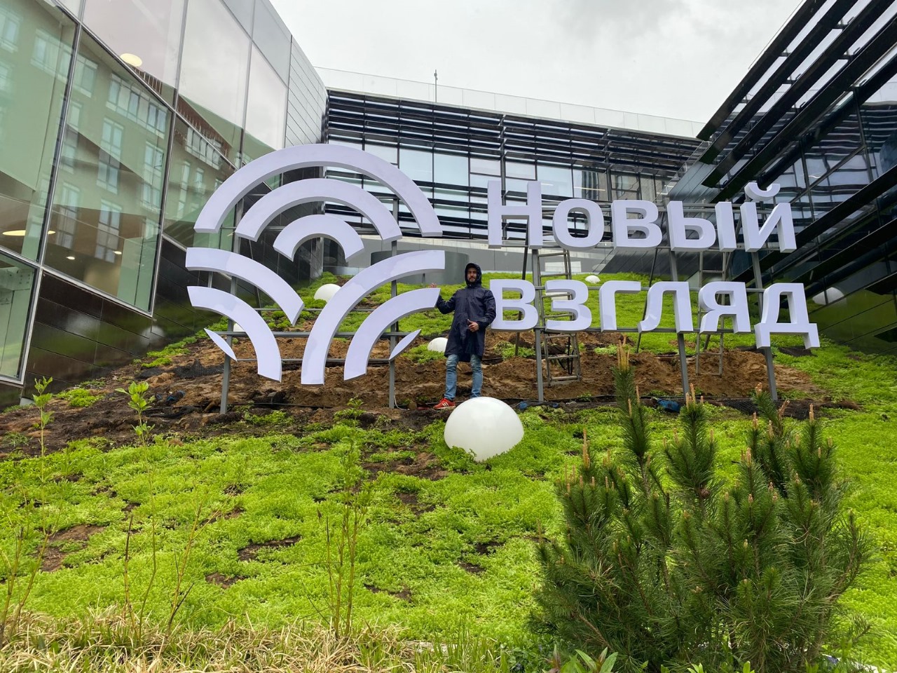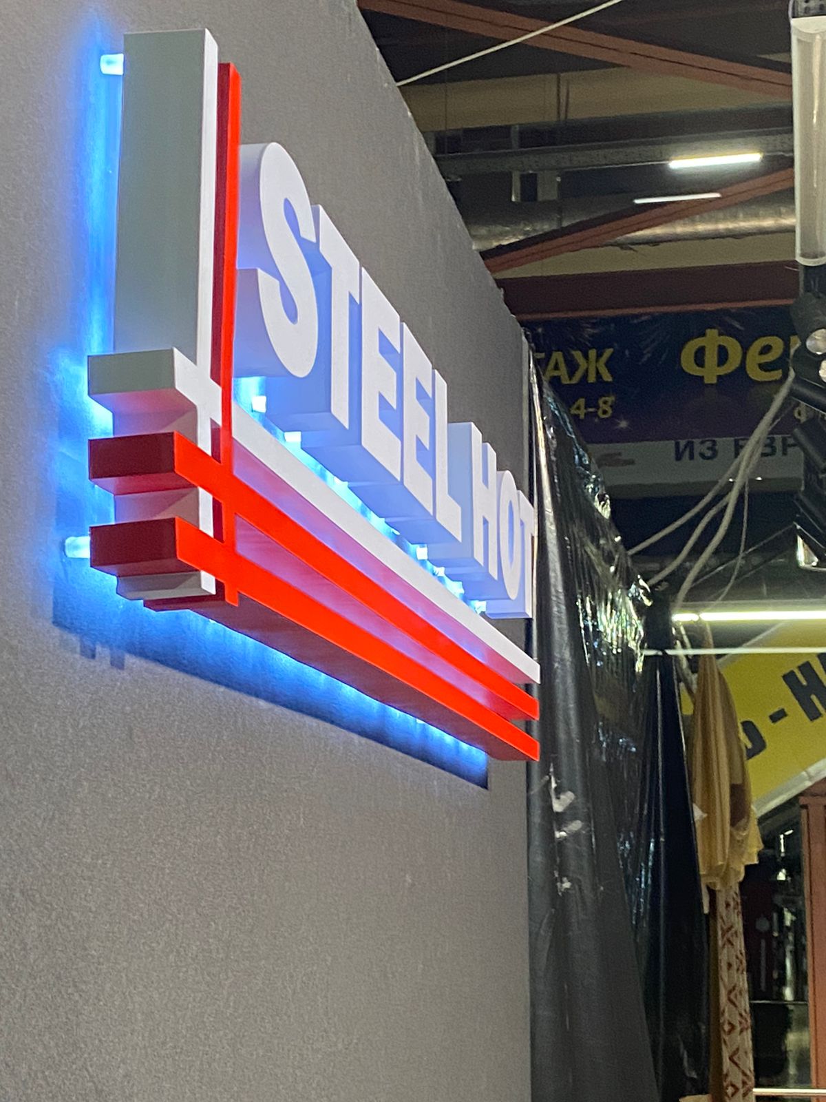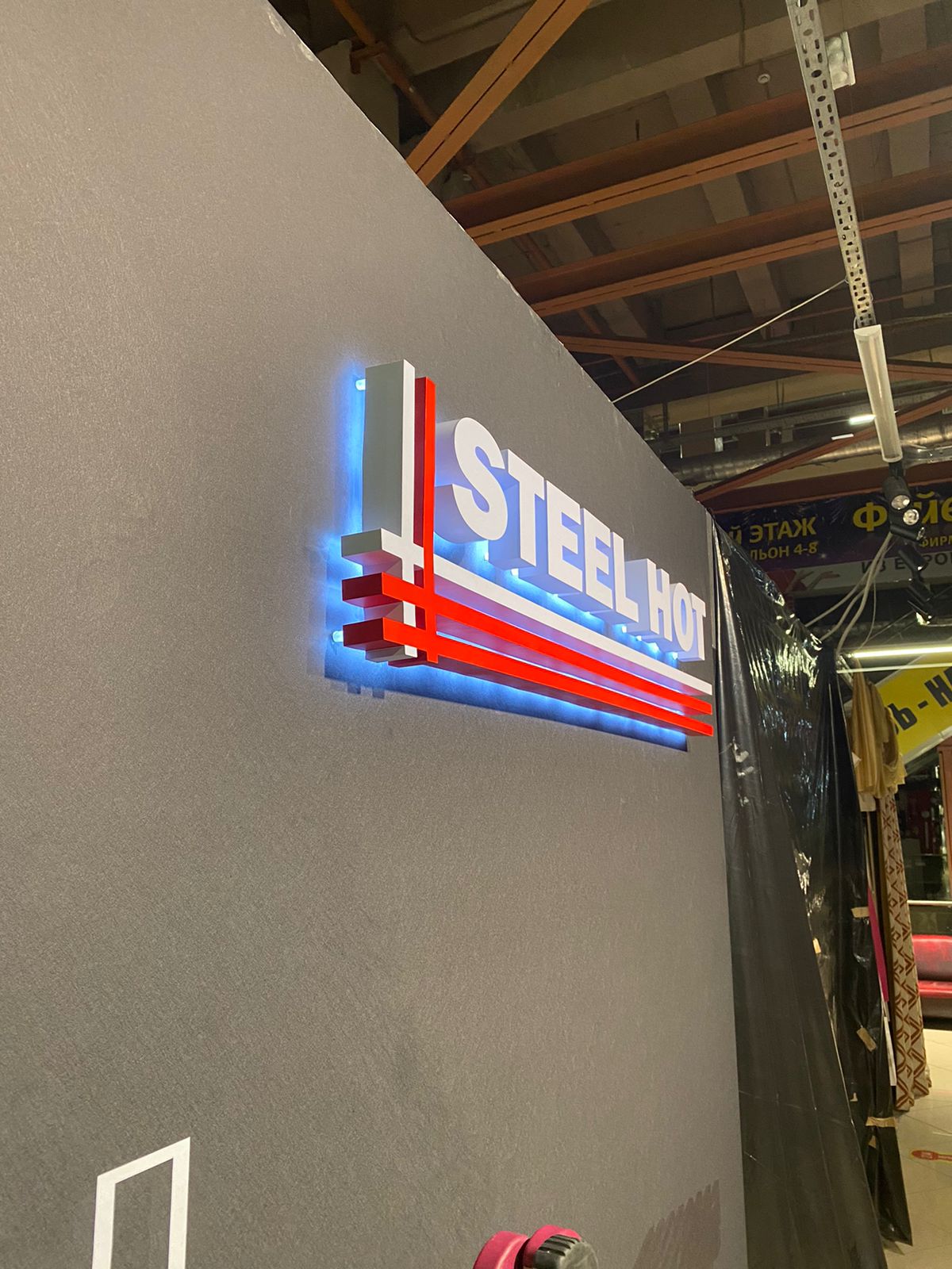 На встрече с клиентом уточнили размеры места установки (на земле), бюджет и требования к типу и дизайну светового логотипа. Дизайнеры предложили несколько вариантов, и клиент выбрал световой логотип из акрила высотой 2,5 м. При помощи 3D-макета определились с дизайном, логотип из объемных букв с лицевой подсветкой.