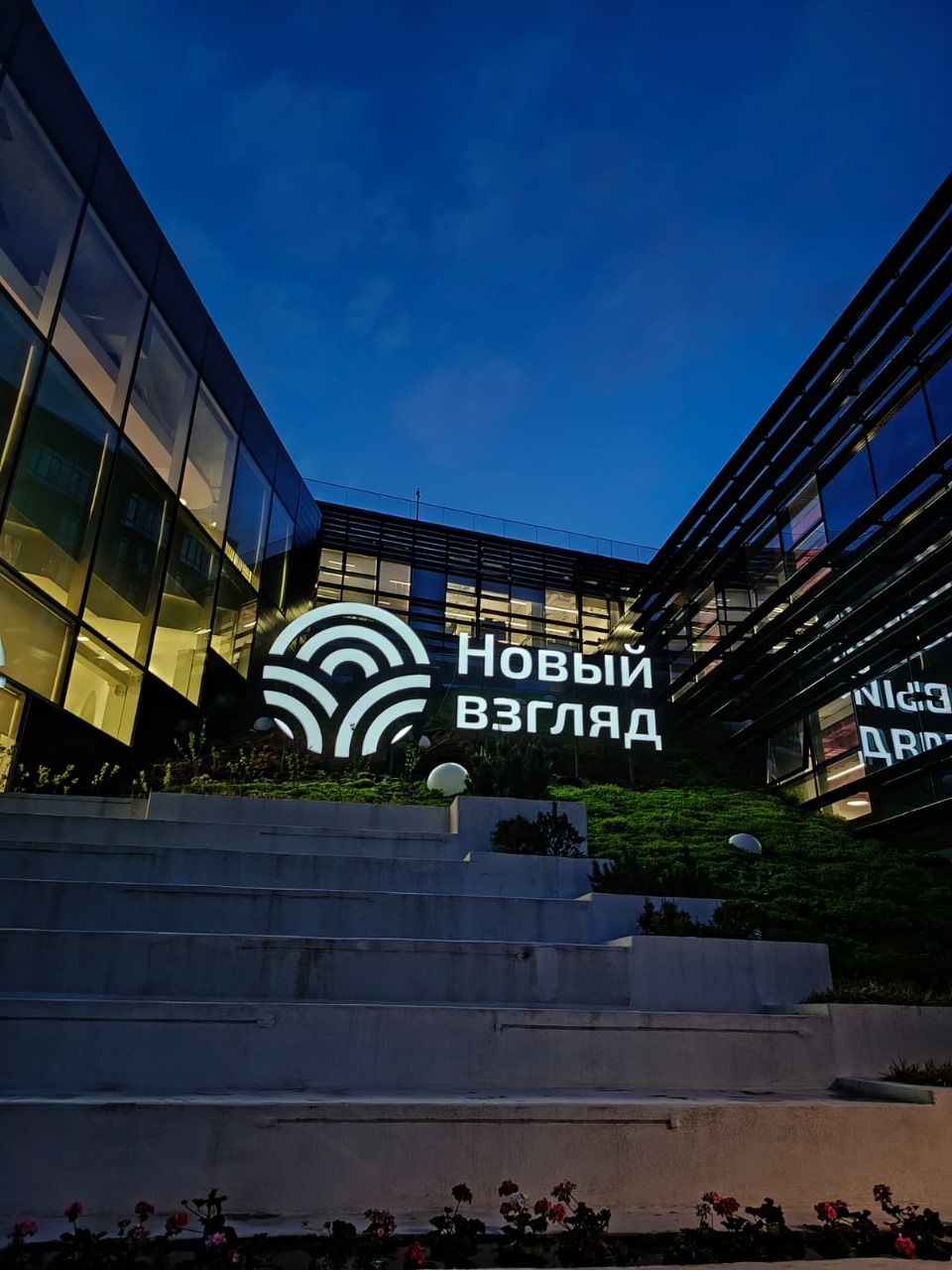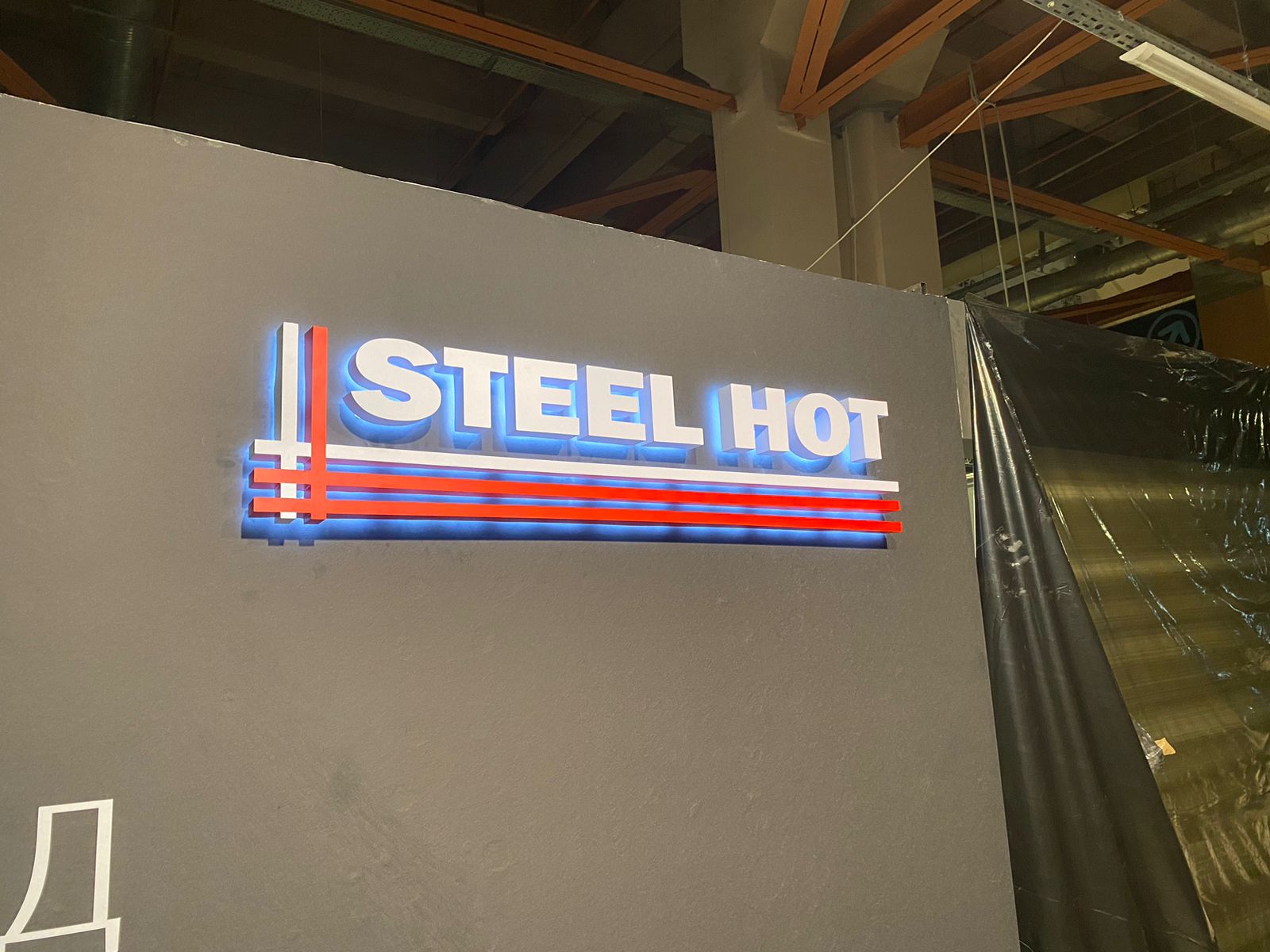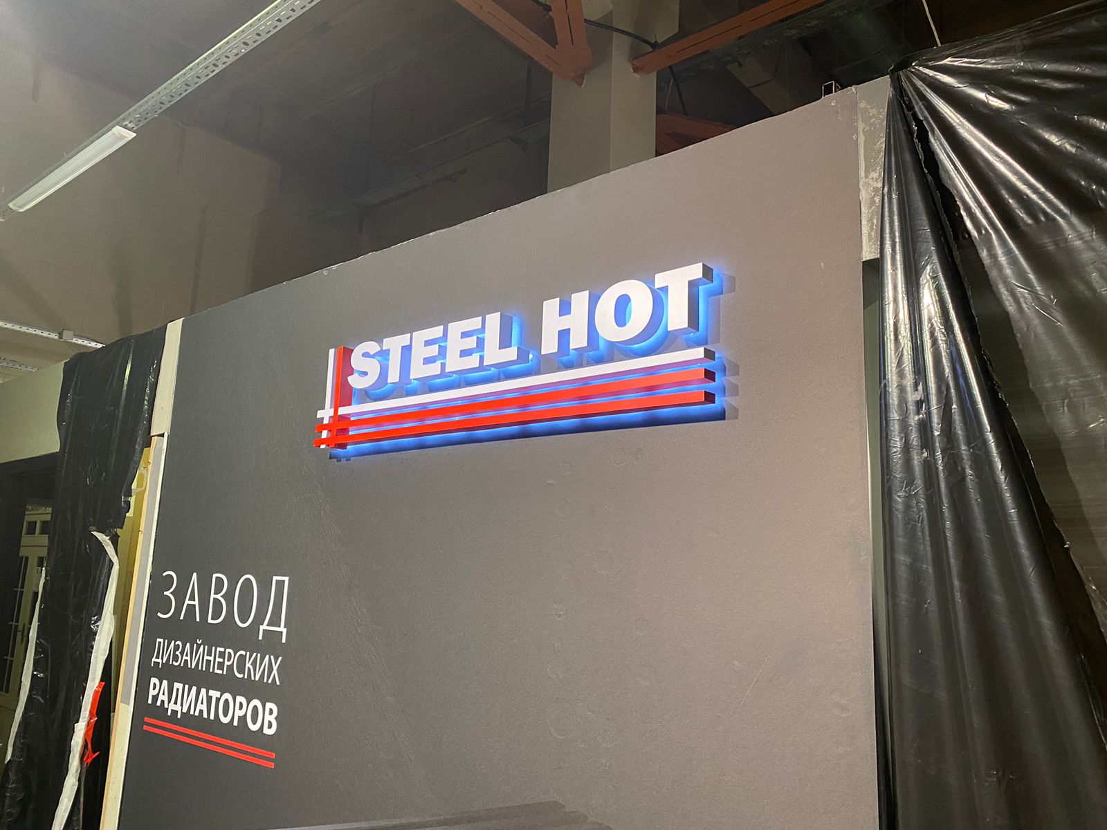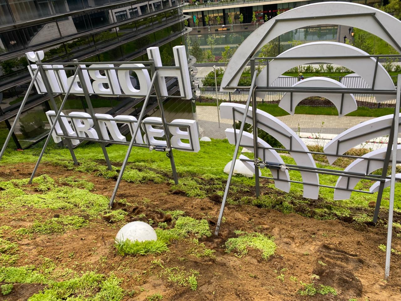 На встрече с клиентом уточнили размеры места установки (на земле), бюджет и требования к типу и дизайну светового логотипа. Дизайнеры предложили несколько вариантов, и клиент выбрал световой логотип из акрила высотой 2,5 м. При помощи 3D-макета определились с дизайном, логотип из объемных букв с лицевой подсветкой.