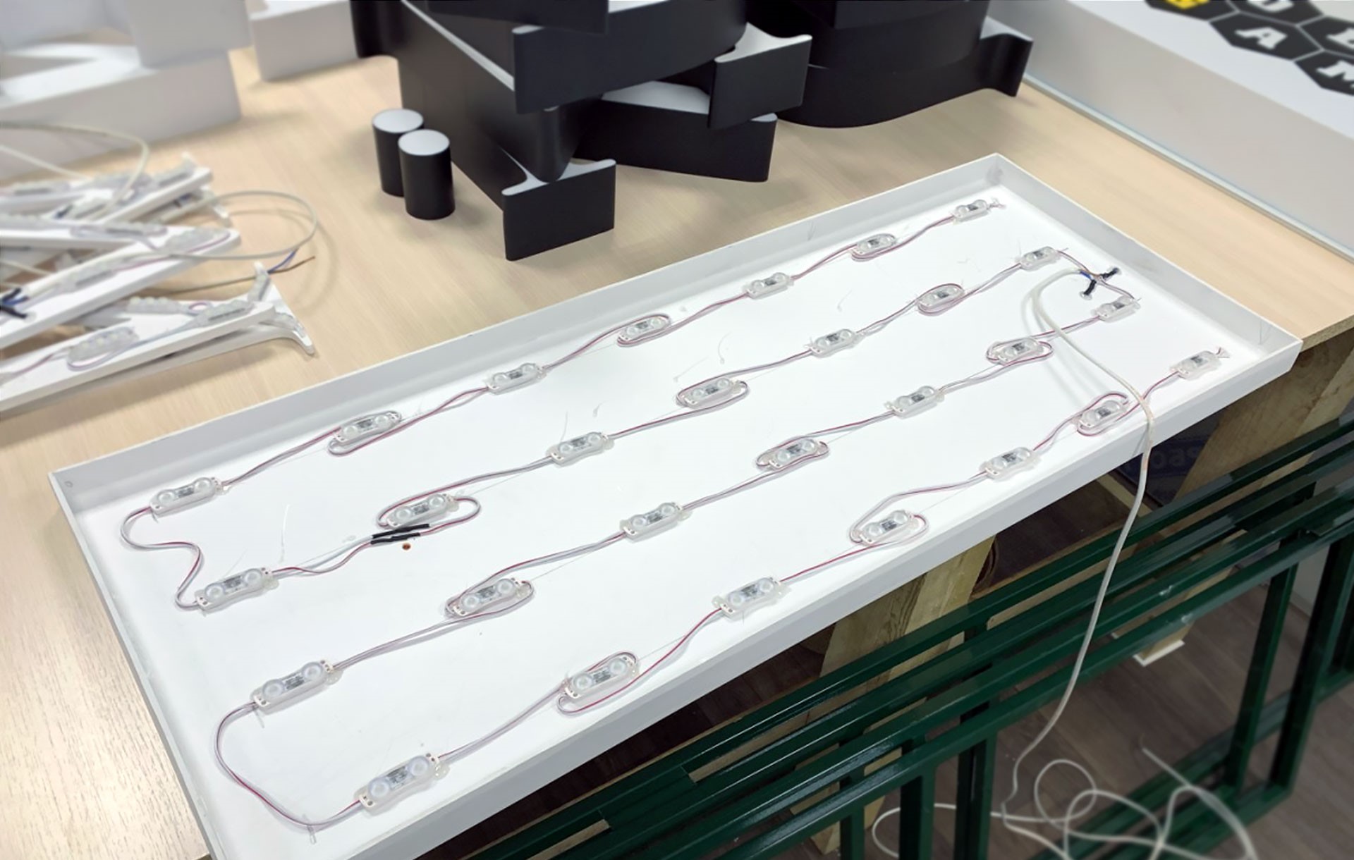 Система подсветки реализована на основе светодиодных модулей, которые установлены внутри профиля. LED-элементы обеспечивают равномерное освещение всей площади вывески и имеют длительный срок службы. Питание подсветки осуществляется через блок питания, защищённый от влаги и пыли.
